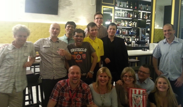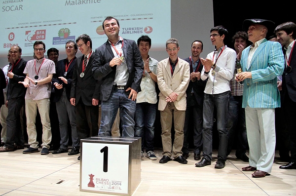 Oslava stříbra proběhla ještě v Bilbau. Zleva stojící: Viktor Láznička, Petr Boleslav, Pentala Harikrišna, Krishnan Sasikiran, David Navara, Mateusz Bartel, Radoslaw Wojtaszek a Zbyněk Hráček. Zleva sedící: Zdeněk Mudra, Jana Mudrová, Alena Mužíková, Roman Mužík a Natálie Konvičková