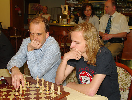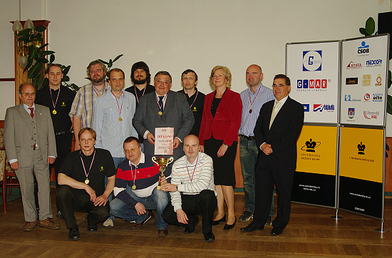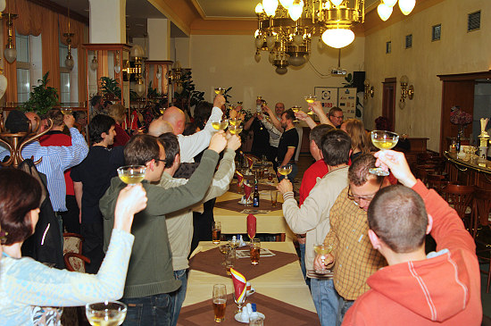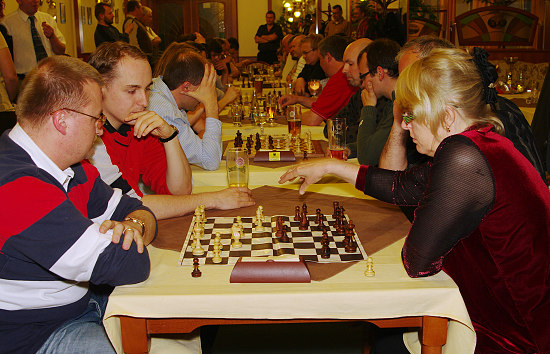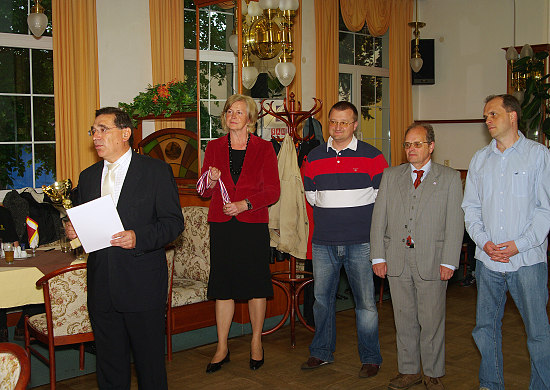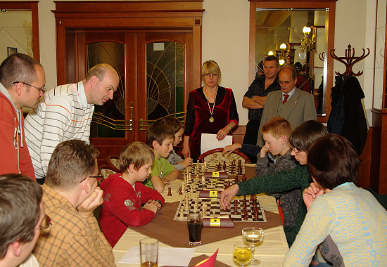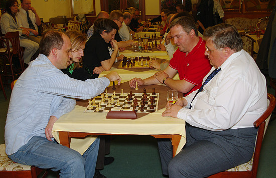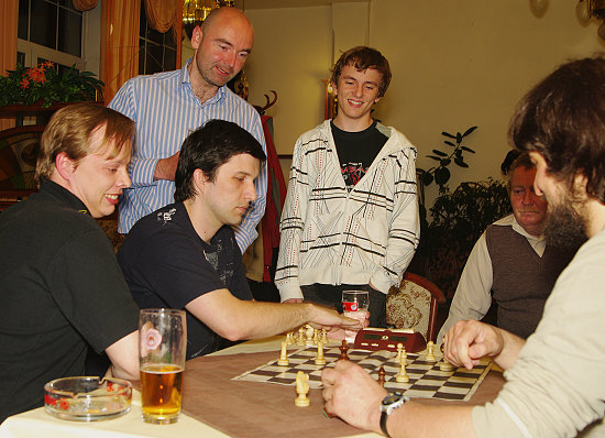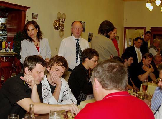 V pátek 14. května se sešli novoborští šachisté a pozvaní hosté v Grandhotelu Pražák. Na programu setkání byla každoroční klubová konference, po roční pauze navíc opět okořeněná o předání poháru pro vítěze šachové extraligy. Jak jsme ale zjistili po příjezdu předsedy Šachového svazu ČR Dr. V. Sejkory, na putovní trofej si budeme muset ještě počkat, neboť její předchozí držitel Mahrla Praha ji kamsi zašantročil a nová se teprve vyrábí. Za město Nový Bor a Liberecký kraj promluvila zastupitelka Ing. Stanislava Silná, která popřála šachistům ještě mnoho úspěšných let a připojil se k ní i zástupce spolku Boráci Borákům Vítězslav Hák. Přípitek pronesl znovuzvolený prezident klubu Roman Mužík, který stanovil jako jediný možný cíl příští sezóny obhajobu titulu a doufá rovněž v další úspěšné vystoupení našeho klubu na říjnovém Evropském klubovém poháru, tentokrát v bulharském Plovdivu.