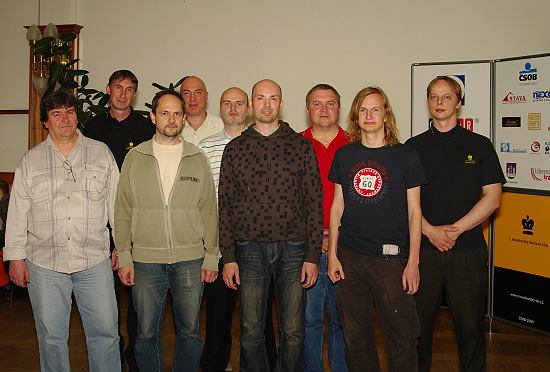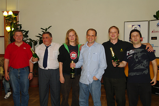 Medailisté blicáku dvojic: (zleva) Stříbrní Břetislav Dalecký a Marek Vokáč, vítězové Jan Oreský a Zbyněk Hráček, bronzoví Viktor Novotný a Pavel Šimáček. (foto: Vladimír Jagr)
