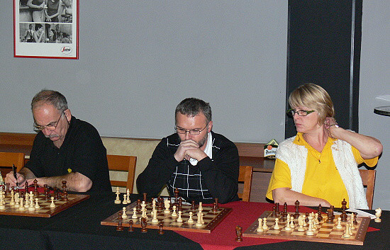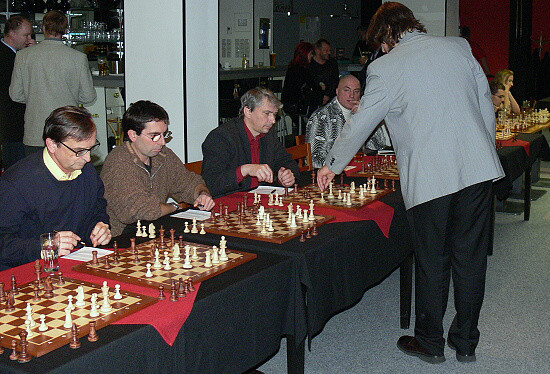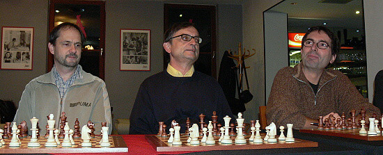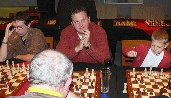 Hned na prvních šachovnicích měl velmistr perné soupeře (zleva): FM Petr Kučera, Otakar Válek a Tomáš Tichý.